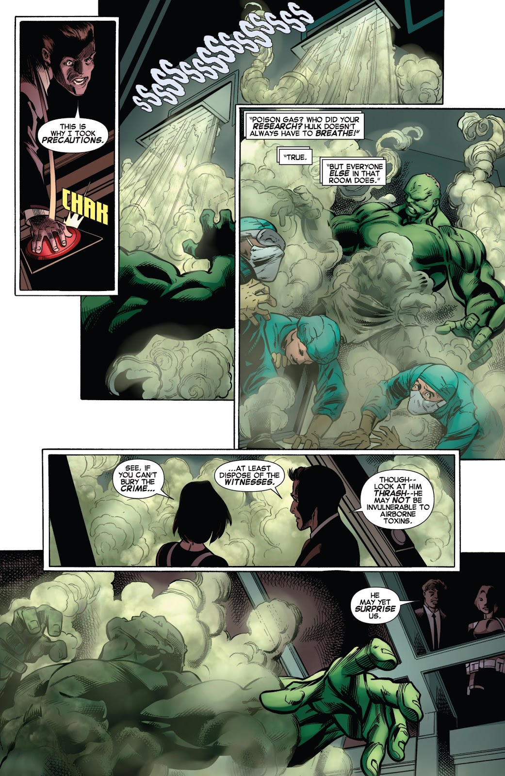 - Superhuman Strength Utilizations: The Hulk can inhale great quantities of air for several effects. For example, he can expel the air at enormous speeds to knock down forests and armed troops. This resource also enables the Hulk to defeat several superhuman opponents, such as the Mister Fantastic. The Hulk can slam his hands together to create a tremendously powerful sonic vibration that propagates through the air and has been compared to the strongest hurricane in history. This thunderclap has been powerful enough to disperse Sandman's attacks, snuff out Johnny Storm's flame ability, and severely debilitate the Red Hulk. It is certainly strong enough to knock away the Avengers. The Hulk's thunderclap sends back the Night-Crawler's sonic beams, destroying the entire universe. The Hulk can also hit the ground with his hands or legs to create violent tremors that thwart opponents and destroy structures, being able to produce destructive shockwaves by stomping his foot. He could also create shockwaves with enough power to shatter glass jars by simply snapping his fingers while possessed by the One Below All.