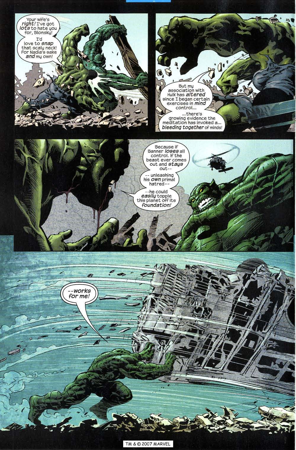 - Self-Restraint: When Banner is the Hulk, he can influence the Hulk's behavior to a limited extent. However, several facts indicate that Banner subconsciously restrains the Hulk. For example, the Hulk asked for Jean Grey to psionically shut Bruce Banner off so that the Hulk's sheer power could be unleashed against the threat of Onslaught. Moreover, the Hulk has further stated that Banner's constraints prevent him from destroying the planet. In another occasion, Iron Man has also deduced that Bruce Banner exerts a moderating influence on the Hulk, and Tony even indicated the Hulk normally moderates and regulates the potency of all his punches. In a classical combat between Thor and the Hulk, at one point it is narrated that Banner was suppressed. Doctor Samson has pondered that, while extensive destruction was caused by the Hulk, he never killed a single soul confronting the army. The Immortal Hulk recognized that Amadeus Cho's hypothesis about Banner exercising subconscious control on the Hulk is plausible, though it works only for the other classic incarnations of the Green Goliath. Upon being subjected to the Nightmare's machinations, the Hulk also aroused his uncontrollable inner savagery, revealing that Banner had lost ascendancy over the Hulk, which ultimately resulted in Banner's psychic suicide. In yet another instance, the Professor X, before an imminent confrontation between the Hulk and the X-Men, scanned the Hulk's mind and discovered that Banner was in control and the Hulk posed no threat, which was soon confirmed by the team. In fact, Banner has even stimulated the Hulk to hit the time barrier with the maximum strength he ever demonstrated, suggesting Banner had never allowed the Hulk to exert so much strength before. During a battle against Thor and the Iron Man, Banner also stipulated that since Hulk thought he was in a simulation, he would not hold back, which manifests again that the Hulk usually restrains his power.