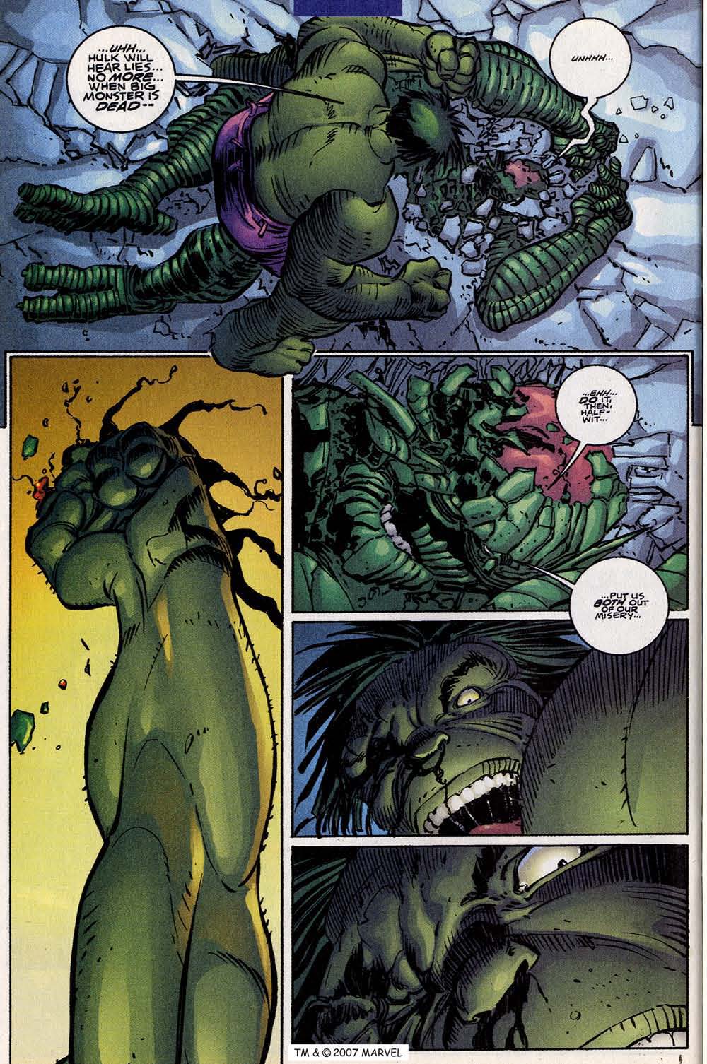- Regenerative Healing Factor: Despite the Hulk's high resistance to physical harm, it is possible to cause the Hulk injury. However, the Hulk is capable of regenerating damaged or destroyed areas of his entire body with much greater speed and efficiency than an ordinary human. In fact, the Hulk was able to systematically regenerate his internal organs and tissues in an alternate reality. He was also able to literally rip off a large fraction of his head allowing it to completely regrow. In a notorious episode, the Maestro persona molecularly rebuilt his body after being atomized. The Hulk also demonstrated his exceptional healing capacity when, during a battle with Vector, all of his skin and most of his muscle mass were extracted from his body. The Hulk regained his mass and healed within only seconds. Even the Omega-Level biokinetic Elixir's death touch could only retard him temporarily. Most extreme depictions of his healing factor also include reintegrating members isolated from his body. The Hulk's regenerative healing factor also enables him to resist to physical transmutations. Additionally, the Hulk heals faster and more extensively the madder he gets. For example, Scorpion (Carmilla Black) once injected into Hulk's body a chemical substance that counteracts his healing factor. Amadeus Cho then caused the Hulk to get enraged enough for his immune system to repel the substance. Combined with the Hulk's superhuman durability, it makes him exceedingly difficult to defeat or incapacitate, as noted by Wolverine during their second battle.