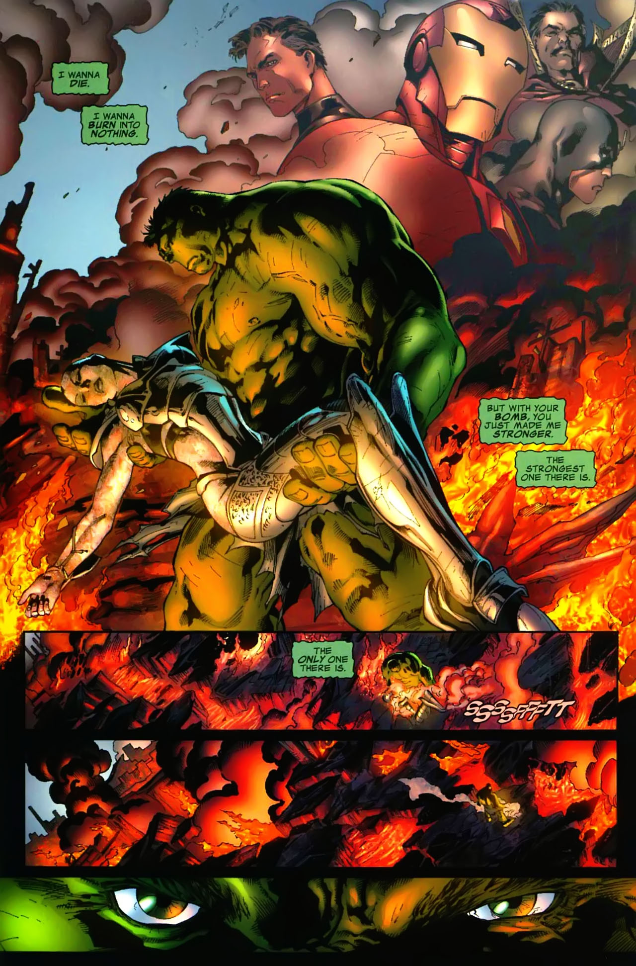 - Dynamic Durability: In addition to immense strength, the Hulk's body possesses a high degree of resistance to physical injury. The Hulk has survived tremendous amount of punishment throughout his career. The Hulk's skin is impervious to conventional blades, Adamantium and Vibranium being strictly the few known metals that can effectively pierce and penetrate his skin. The Hulk was even able to remove Adhesive X from his body without any injury. This invulnerability extends to the optic system since bullets, grenade shrapnel, Hawkeye's arrows, and even the Valkyrie's enchanted blade Dragonfang did not penetrate nor damage it. The Hulk is capable of withstanding high caliber bullets, powerful energy blasts, pressures extremes, falls from orbital heights, maximized heat without blistering, maximized cold without freezing, and also massive impacts. The Hulk has withstood several times the impact of ground zero nuclear explosions, the Human Torch's Nova Blast, with a maximum temperature of one million degrees Fahrenheit, and also the crushing pressures of 100Gs without suffering damage or harm. In fact, when the Maestro's Dog O' War, a robot claimed to be able to crush Adamantium in its jaws in 7.3 seconds, had Hulk's exposed neck in its jaws, it was unable to even lacerate his skin before being ripped apart. In another monumental example of his durability, the Hulk even withstood being subjected to a mechanism capable to easily soften and manipulate Adamantium. The Hulk was also able to withstand a planet-devastating impact, a planet-shattering impact at point blank range, the Galaxy Master's planet-destroying strongest attacks, even when their potency was later amplified ten times, a colossal blow from a Phoenix's empowered Cyclops, phenomenally powerful blows from the extremely powerful Zom-empowered Doctor Strange, and a mighty blast from a somewhat hungry Galactus. The Hulk even withstood exposure to magical energy calculated as over 100 times more powerful than Hercules' strongest blows, and also the overwhelming pressure and kinetic energy of a literal supernova bursting on his body. Upon being drained by Iron Man, while wearing the most recent Celestial armor crafted by himself, Hulk withstood extraordinarily powerful blasts with potency of one hundred thousand supernovas. In addition, Hulk withstood Sentry's vastly powerful attacks, equal to one million supernovas. The Hulk even withstood a few of the incredibly powerful blows from Zeus when relatively calm. The full force of the Cyclops's optic blasts, estimated by himself to be powerful enough to rip a small planet in half, only caused minor damage, while previously his ultimate blast was completely ineffective against Hulk and only retarded him. The Hulk has also withstood multiple blows from beings such as the Mighty Thor and the Abomination on a regular basis. The Hulk's durability, much like his physical strength, is fueled by rushes of adrenaline while angry. This was also exemplified when Wolverine stated during World War Hulk that the Hulk's Hulk's skin was harder to damage, when the Hulk withstood a two times more powerful blast from the Captain Marvel than a blast that had previously damaged him, and when during a battle against Colossus he stated that the harder he hits the Hulk, the less it seems to hurt him. This was further exemplified when Wolverine's and Black Panther's claws failed to hurt the Hulk.