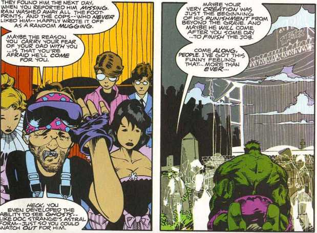 - Astral Form Perception: The Hulk has the unique ability of being able to see "astral forms," or ghosts, and even physically interact with them. This power has come in handy when working with his fellow Defender, Doctor Strange, who is able to leave his body in an usually invisible, ghost-like state better known as an astral form. Bruce Banner subconsciously feared his father's ghost would come back to haunt him, and so the Hulk developed this mechanism to allow him to look out for him. More recent events have shown that the power to see astral forms may now extend to Bruce Banner. However, it was suggested the clarity of the astral forms is diminished when compared to the Hulk's ability to view them. The Hulk's ability to see astral forms may go beyond just seeing individual spirits. The Hulk once experienced a whole town in the middle of the desert that then faded away into nothing. While it is possible it was merely a mirage, it is possible the Hulk was able to see a town that did not exist in our plane of reality that no one else could see.