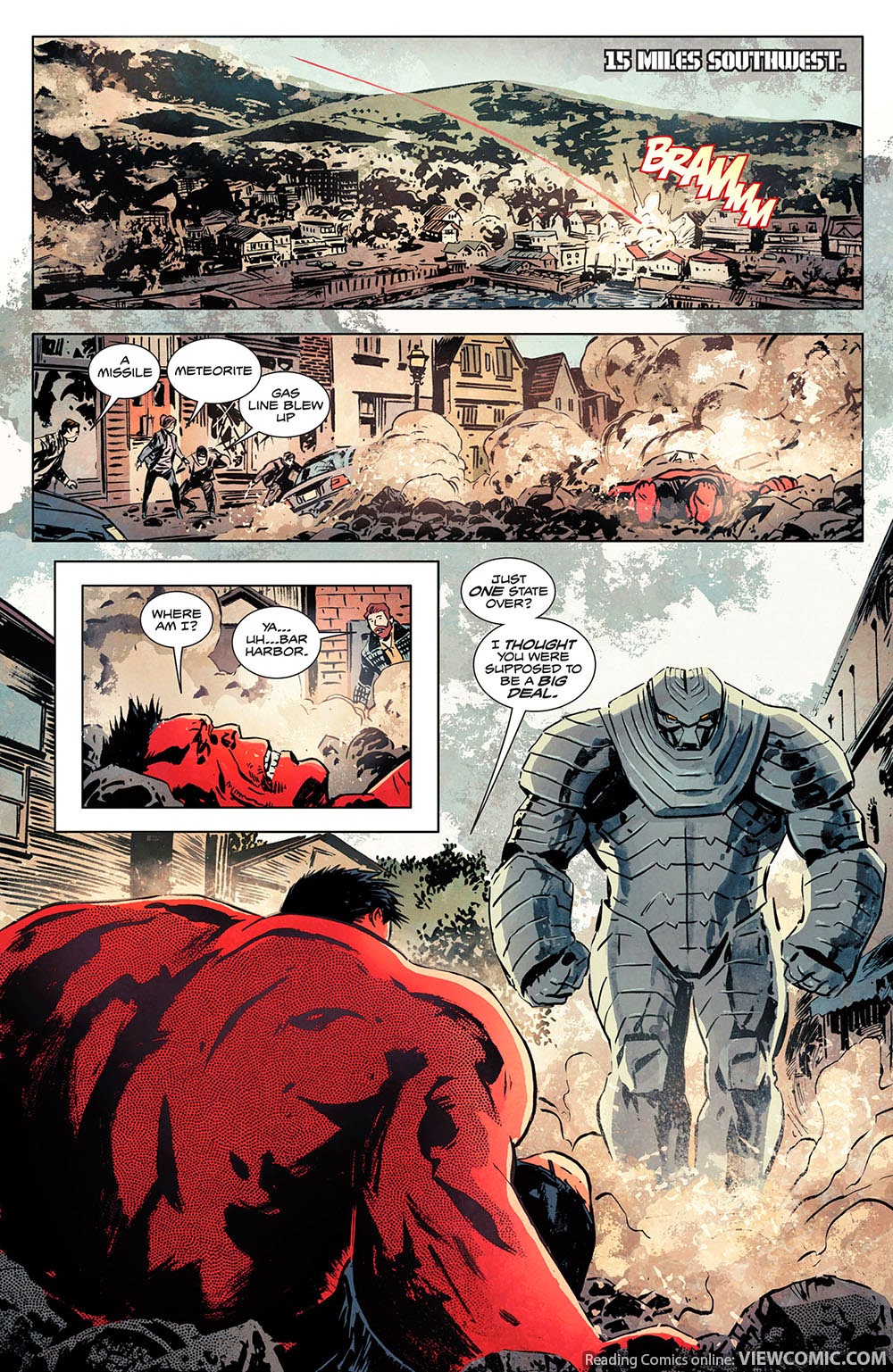 In the first comic called Red Hulk, he first appeared killing Abomination. Doc Samson and She Hulk was investigating the murder. he battled the Hulk twice. He won the first time but the Hulk used a tactic on him the second time. But Rulk was still not dead. Before he could get his name out, Doc Samson shot him and told him that he couldn't go around telling secrets. At the same time, General Ross was talking with Rulk.